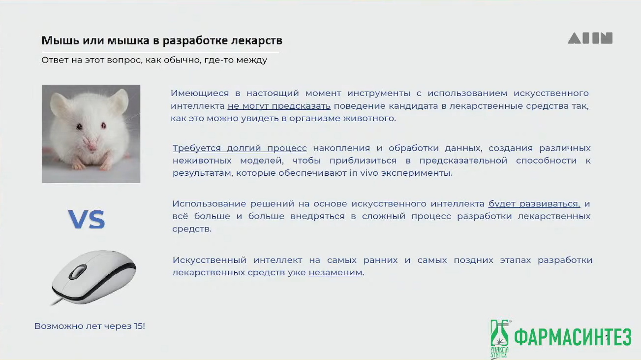 Также есть множество компаний, которые работают над ускорением разработки: в начале работы над препаратом, до тестирования на мышах, идет поиск мишени, которая вызывает заболевание. Многие препараты застревают здесь из-за ошибки в выборе мишени, ИИ позволяет ускорить этот процесс.
