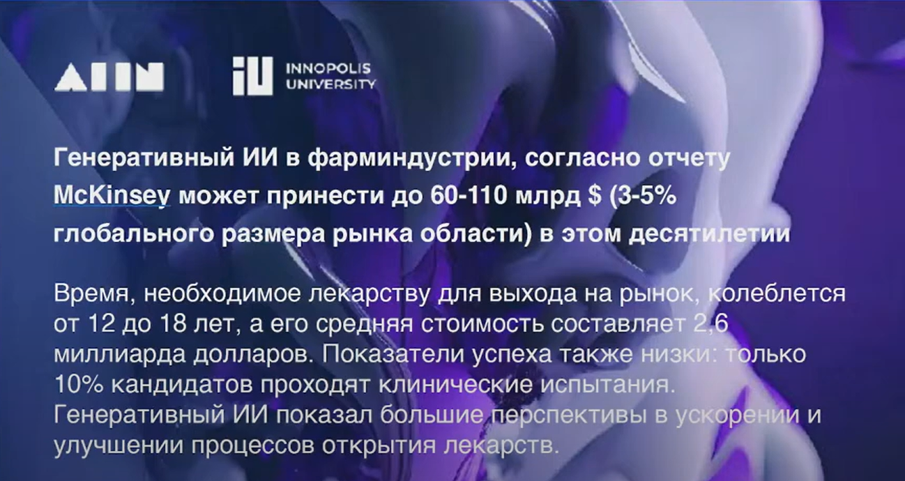 У ИИ в области фармы — уже сейчас огромные возможности и перспективы. Мы в Иннополисе разрабатываем платформу по поиску новых лекарств — drug-discovery. В будущем она должна охватывать все фазы разработки — от открытия мишени до подбора малых молекул, которые взаимодействуют с ними и оказывают терапевтический эффект.